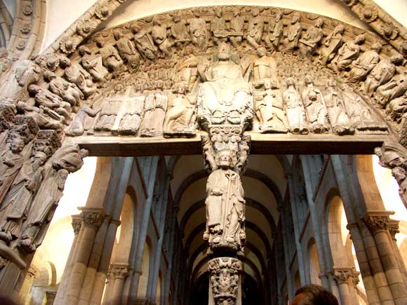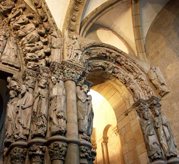 A Dicsőség kapujának jobboldali íve a kőszobrokkal, és a boltíveken a hangszerábrázolásokkal