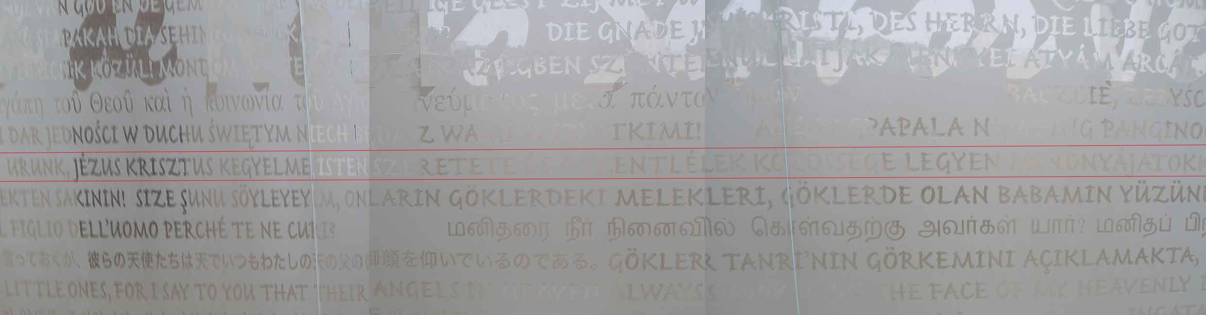 A Szentháromság bazilika bejáratánál az üvegfalon a világ különböző nyelvein olvasható, köztük magyarul is: