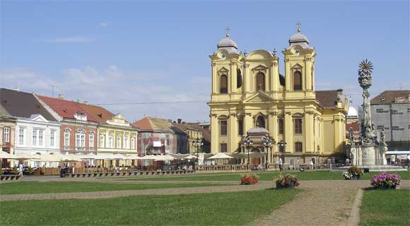 Temesvár régi főtere a katolikus püspöki székesegyházzal. Alacsony tornyainak magyarázata: az állandó háborúskodás miatt a tornyok az ágyúgolyók röppályájának útjába ne essenek bele.